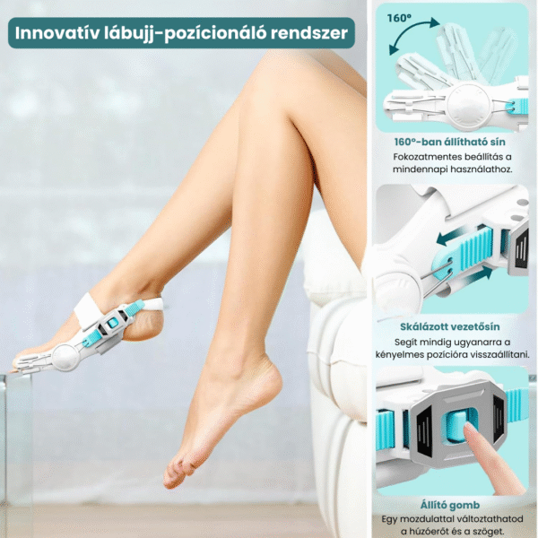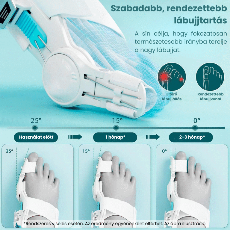 Már az első éjszaka után éreztem a különbséget: nem csúszott el, nem dörzsölt, és reggelre kevésbé volt érzékeny a bütyök. Pár hét alatt pedig tényleg látható lett a változás: a nagy lábujjam elkezdett visszafelé mozdulni, és a járásom is könnyebb lett. Nem hittem volna, hogy ennyi múlik azon, ha végre valóban a helyén tartják a lábujjat.